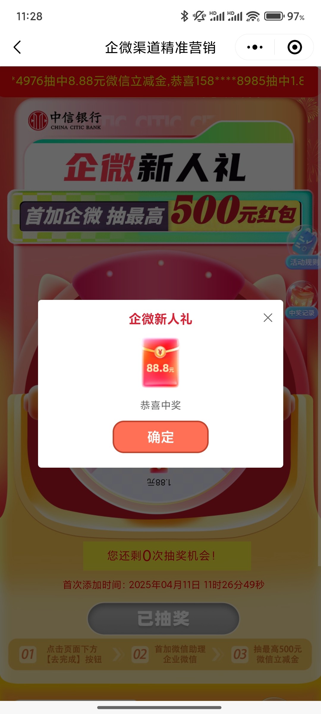 微信搜索中信银行小程序,点击添加企业微信,然后会给你发链接,点进去抽奖就行,88很好中,身边朋友基本都中了88.8,立减金买东西充话费或套出来