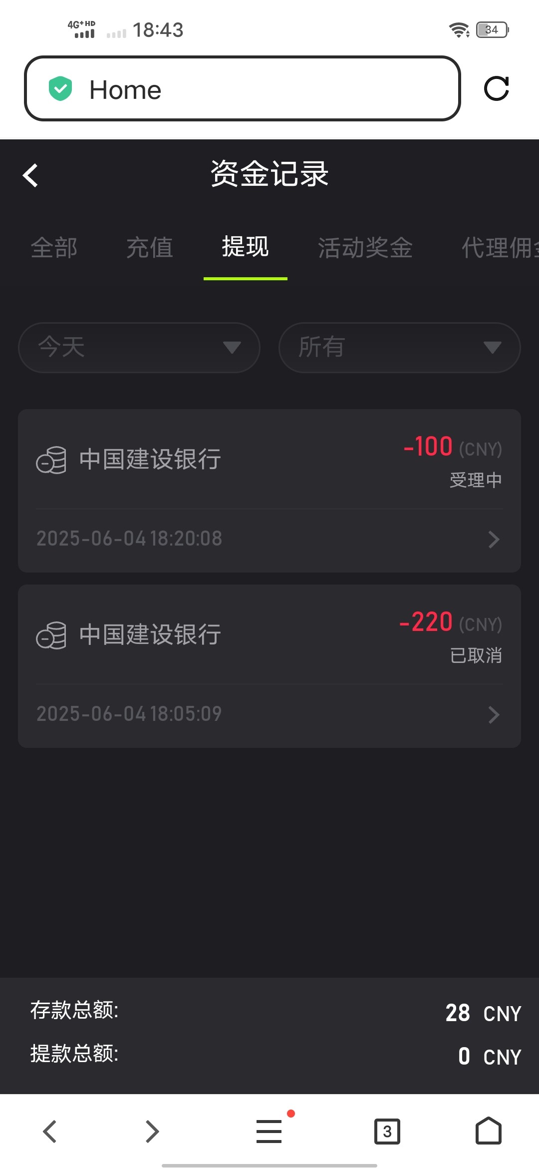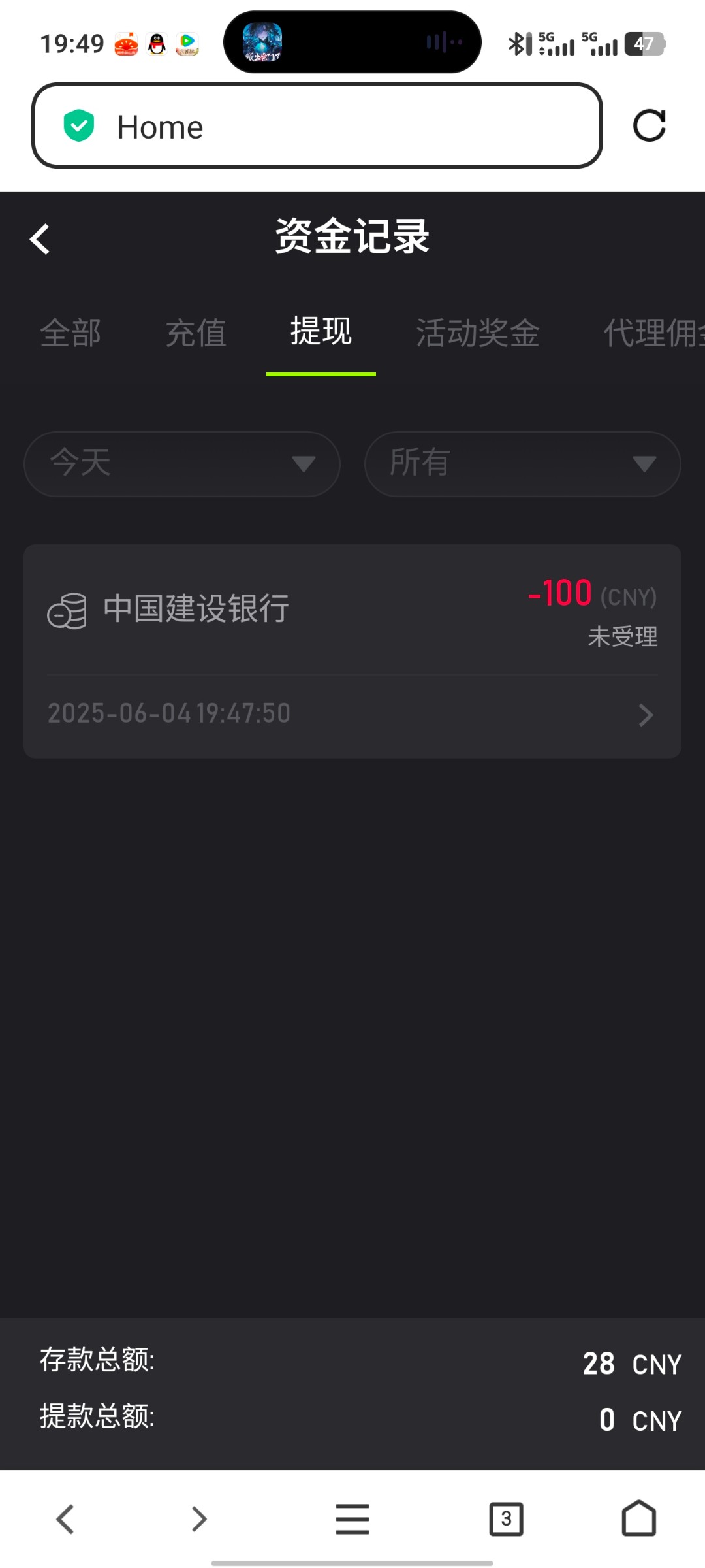 我提220被退回了然后我故意输了120提100直接就是处理中