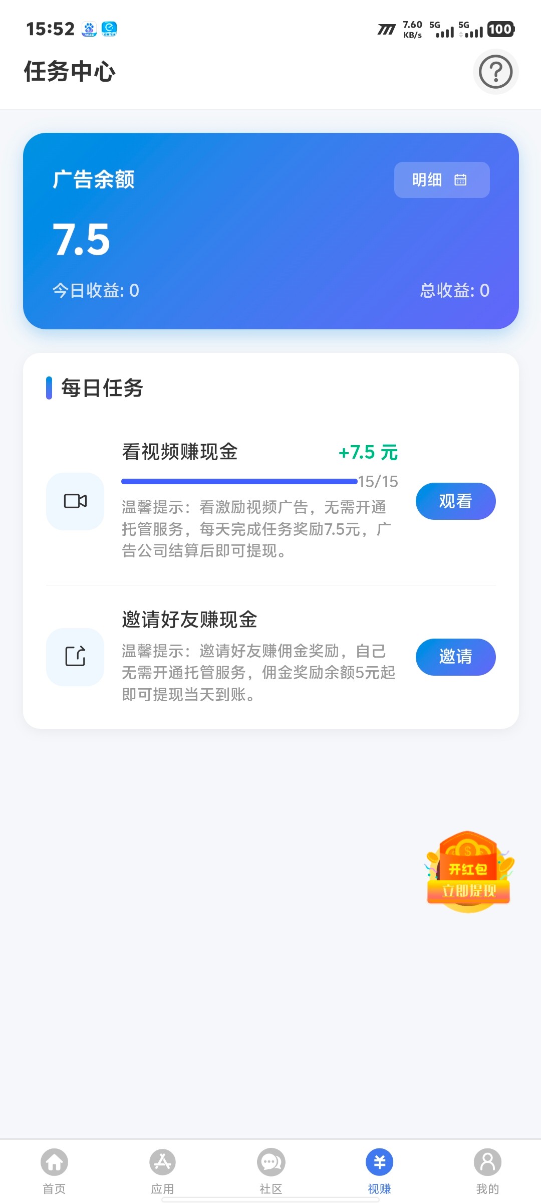 每天有10次提现机会,首次满5就可以提,看视频还能领自己测一下吧,或者等我满了之后我给大家说