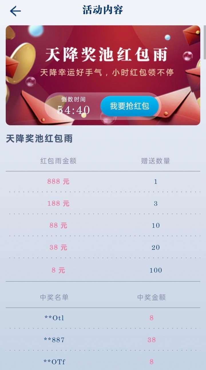 整点24小时抢红包,最低8最高888连续三天。连续三天每天整点抢红包一天可以24次 到点以后点抢红包按钮一直点点点点点 就会抢到最低8最高888 一倍流水没有游戏限制,建议大家去玩彩票 不要玩电子