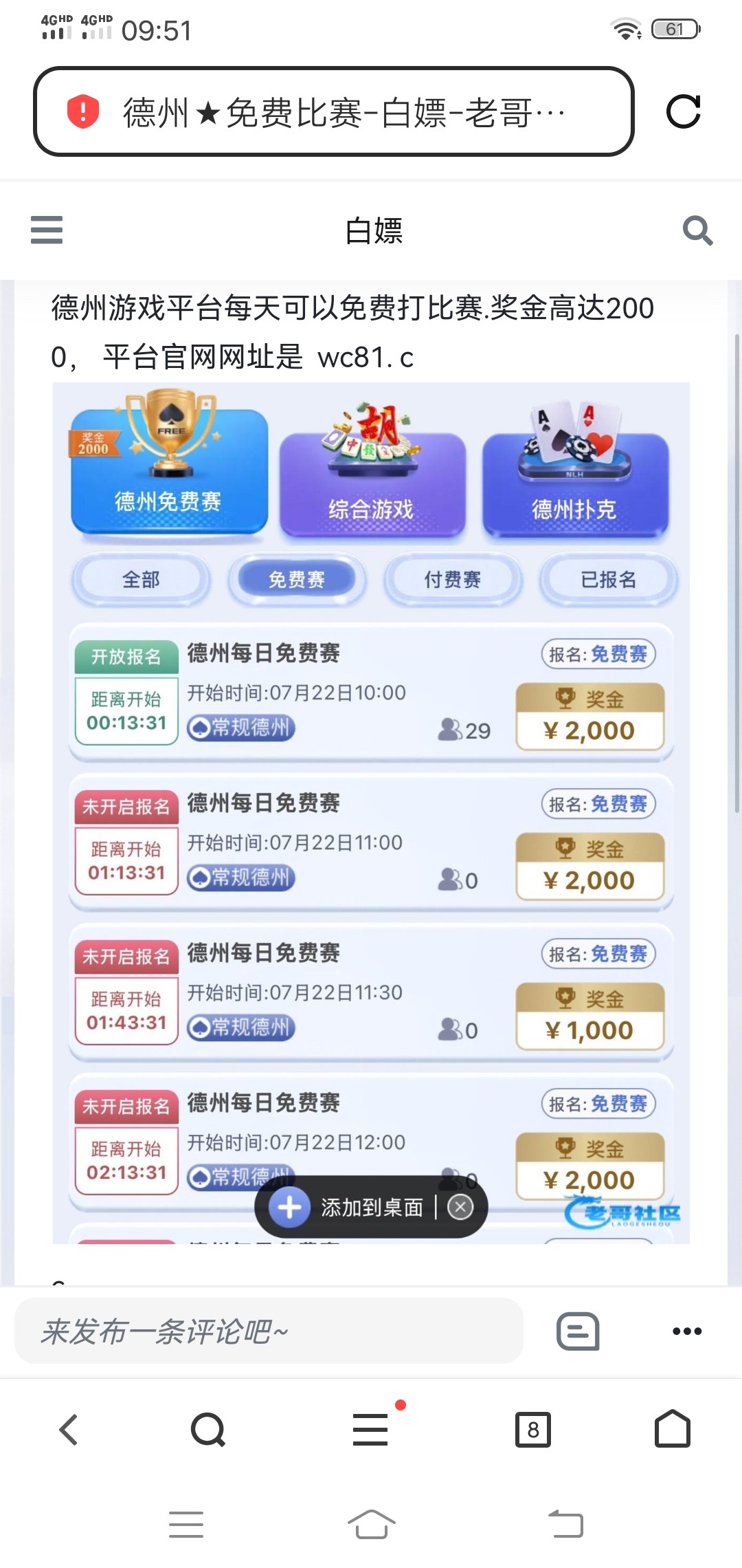 德州游戏平台每天可以免费打比赛.奖金高达2000, 平台官网网址是 W.vip 或 wc81.cc