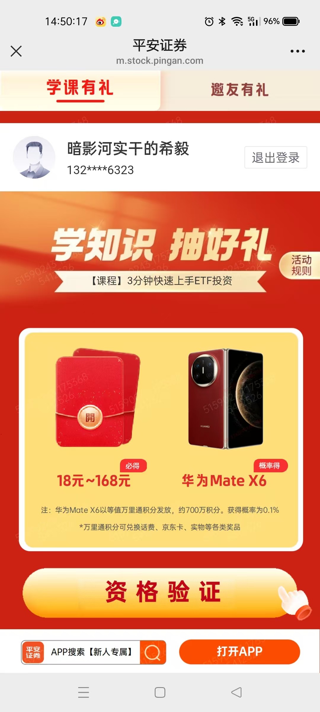 先开户,接到电话 重新扫描二维码领取 关注平安证劵公众号绑定账号 然后下载app登陆点我的 拉下去点你的新客福利已到账点进去就可以看到微信红包 点领取就到账微信了