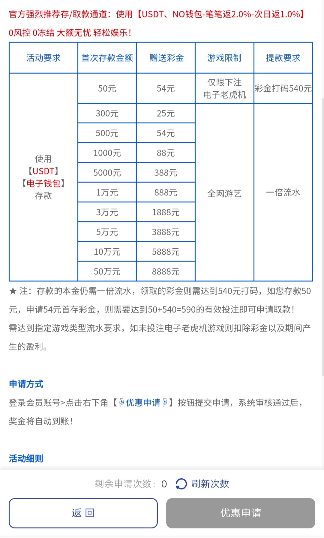 新玩家可以参加首存50+54活动,流水590/540出款,详情参考介绍。