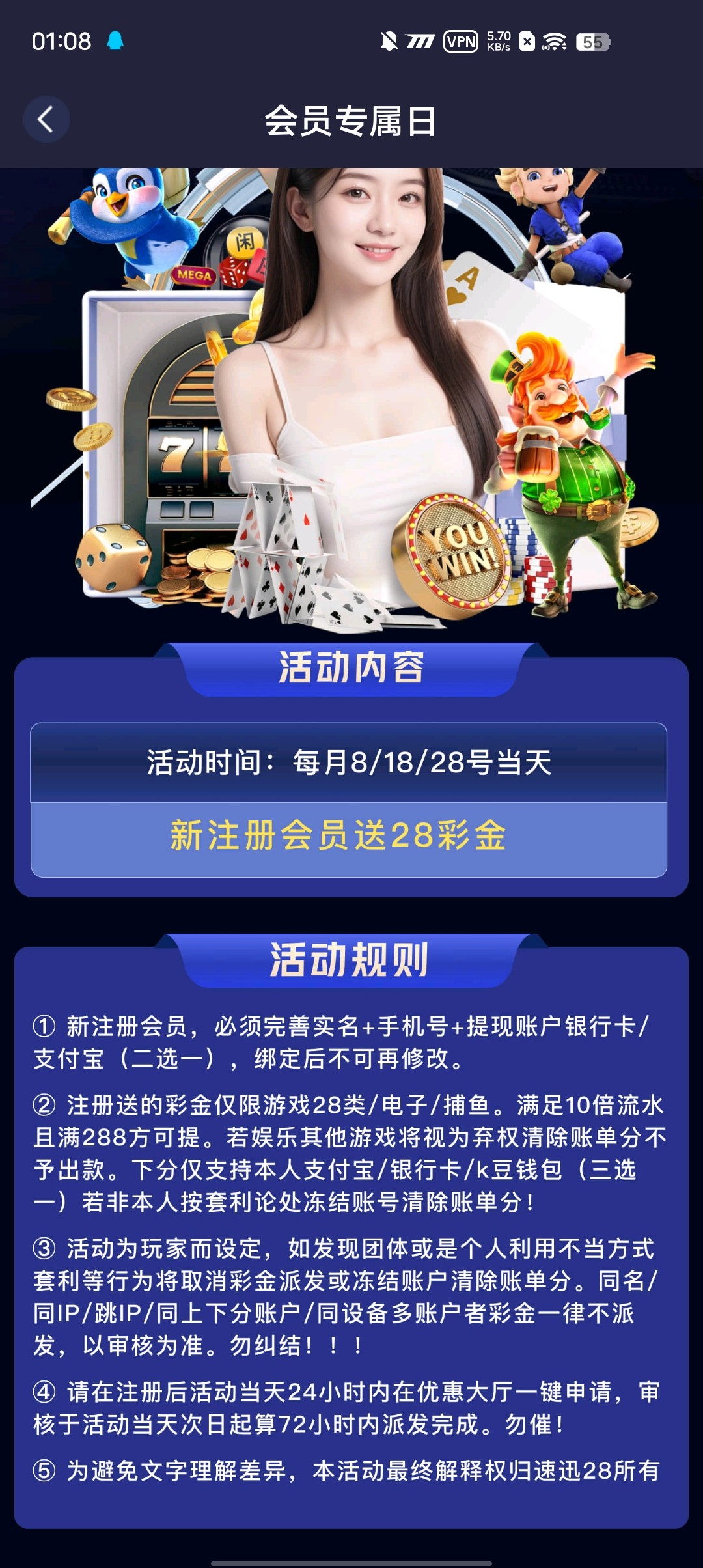 ②注册送的彩金仅限游戏28类/电子/捕鱼。满足10倍流水且满288方可提。