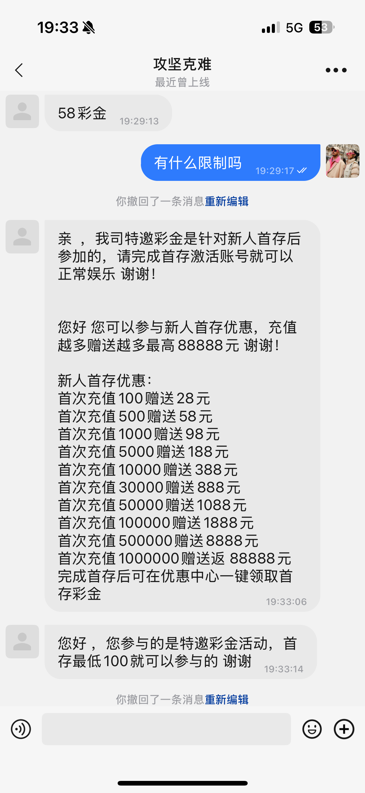 我不知道一群狗在发什么,首先送你58只可以打电子十五倍流水,然后你自己充值一百,也是只可以打电子相当于流水要打1000左右,这不是啊妥妥的给庄家送钱吗