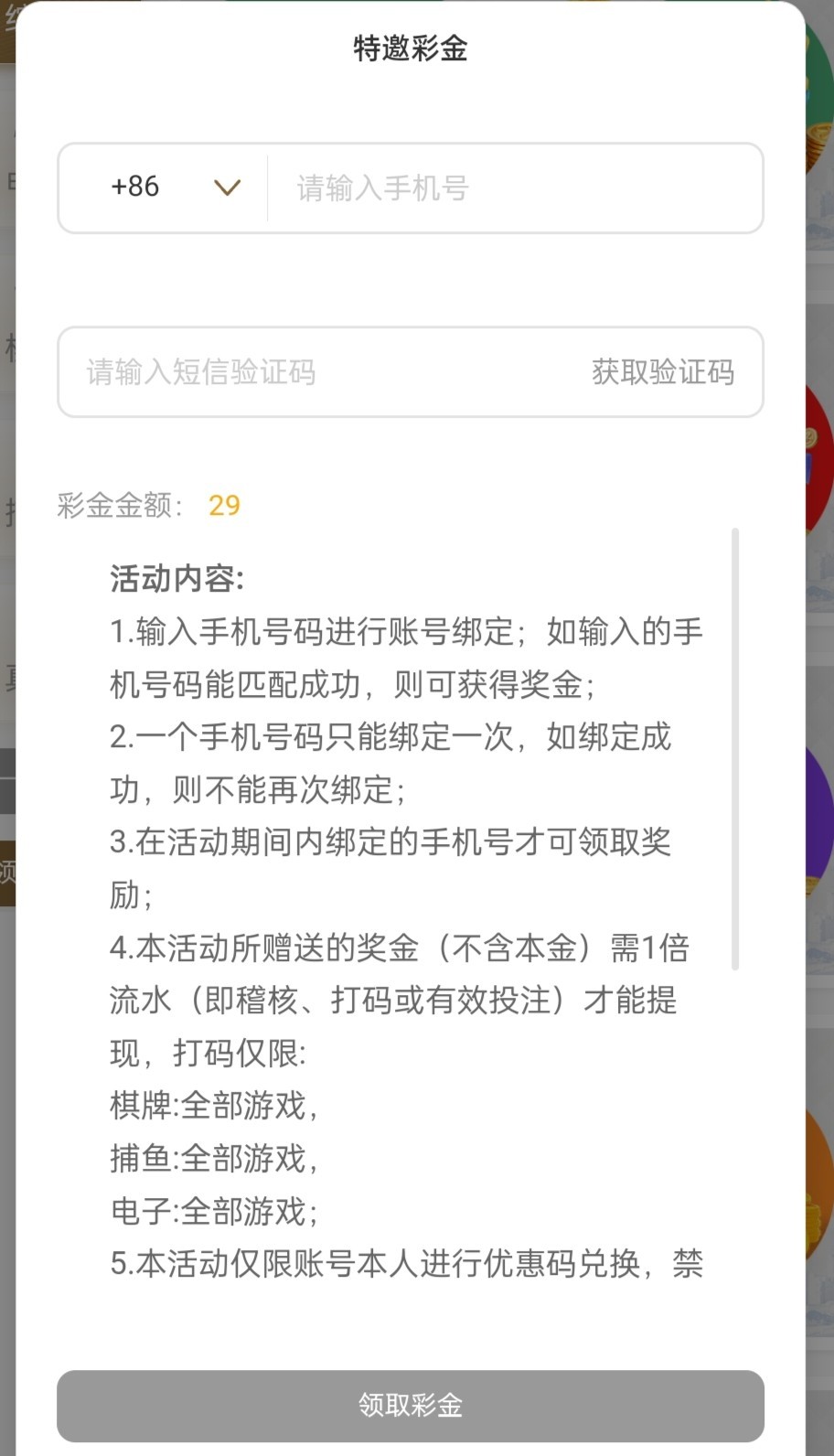 新用户注册绑定手机号,点开活动大厅,特邀彩金页面输入手机号申请!特邀碰瓷!没碰到后面会发短信过来!
