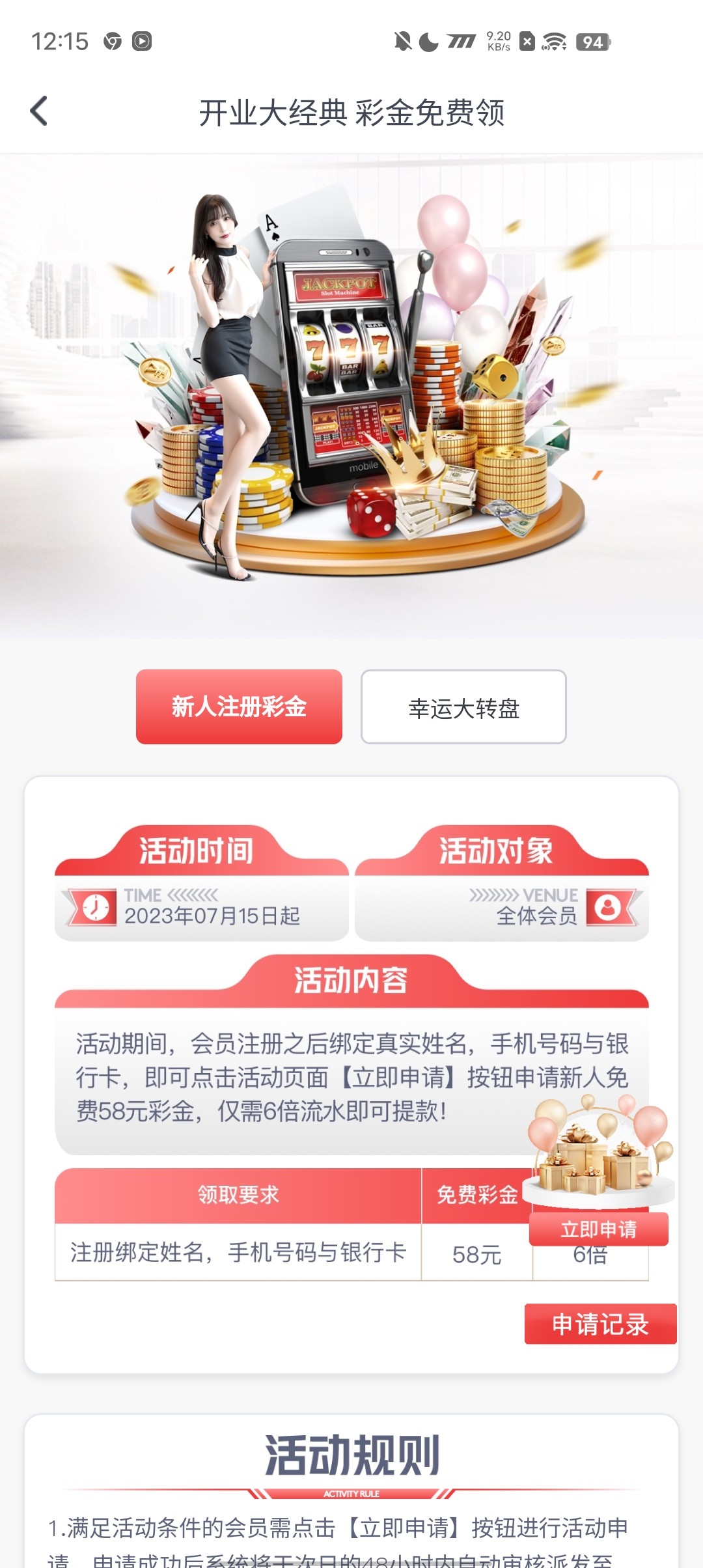 活动期间,会员注册之后绑定真实姓名,手机号码与银行卡,即可点击活动页面【立即申请】按钮申请新人免费58元彩金,仅需6倍流水即可提款!