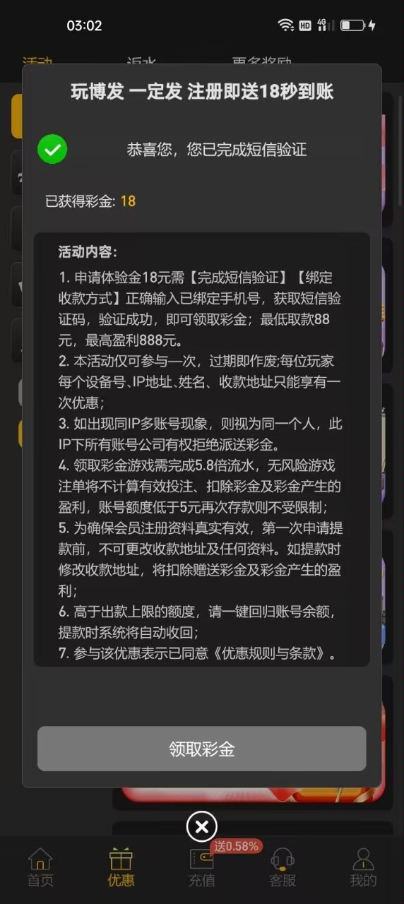 申请体验金18元需【完成短信验证】【绑定收款方式】正确输入已绑定手机号,获取短信验证码,验证成功,即可领取彩金;最低取款88元,最高盈利888元