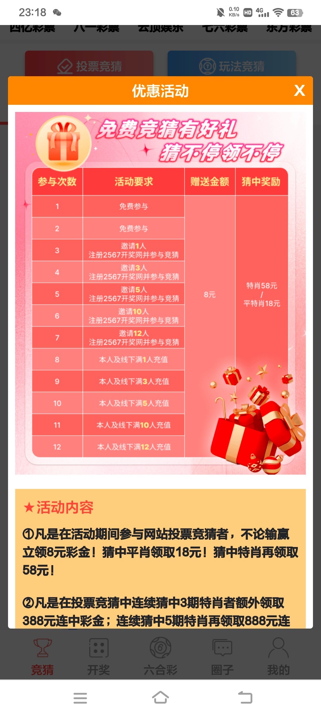 注册账号送每天免费一次竞猜,参与送8,中奖18/58,兑换点击详情进去有客服,兑换到开奖网对接的平台