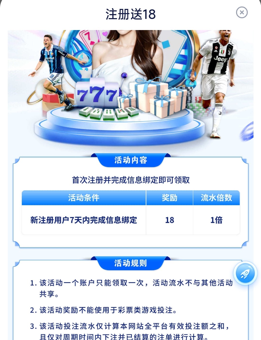 新人注册绑卡完善信息,找客服申请18元彩金彩金一倍水,游戏除了彩票类其他的都可以玩提现100起