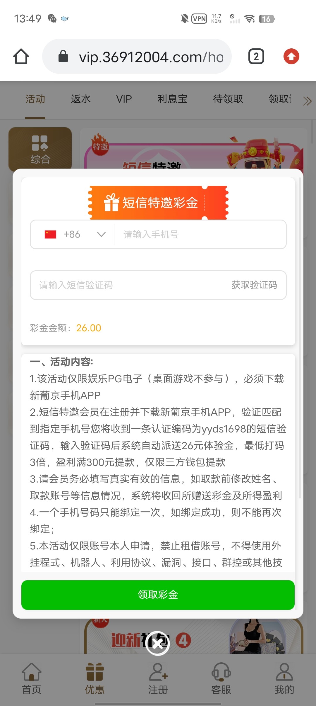 新用户注册绑卡,完善信息。优惠活动自助输入手机号申请26彩金,特邀碰瓷,具体自测!