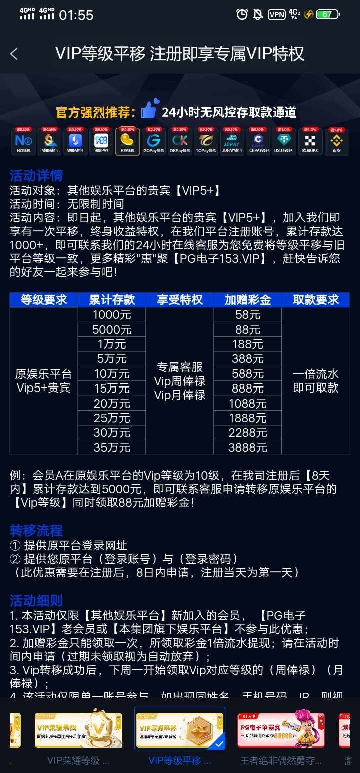 这个建议vip等级比较高的老哥去看看 这个我了解了一下就是假如vip10每个月只需要充值和投注1块钱就可以领取俸禄相当于不用打保级流水 等级特别高的老哥可以转移 两天过后再把账号登录回来改密码 但是需要7天累计充值1千才能转移 有需要的老哥可以去看看